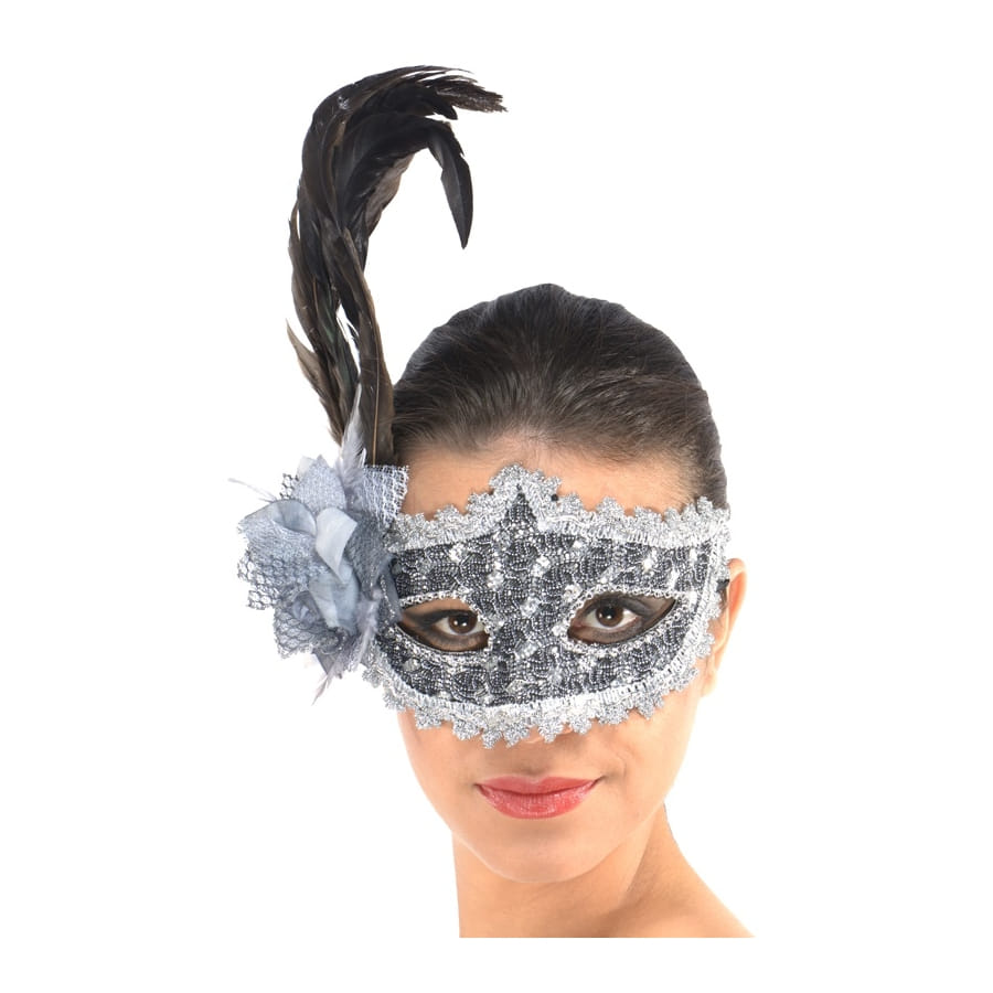 Ce loup baroque argenté avec plumes et paillettes ne peut être mis qu'avec une magnifique robe baroque, à une fête masquée. Ce loup est rempli de paillettes avec une fleur grise sur le côté et une longue plume noire, il vous donnera un côté très sophistiqué. Il est uniquement pour ces dames.