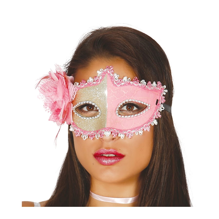 Il s'agit d'un masque vénitien qui présente deux couleurs: une partie de masque est entièrement décorée de paillettes dorées, tandis que l'autre partie est de couleur rose.