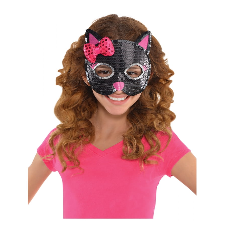 Donnez fière allure à votre fillette invitée à une soirée masquée entre fille, sur le thème Animaux, grâce au Loup chat noir en sequins avec noeud rose, enfant.