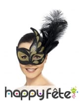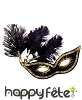Le côté de ce masque est agrémenté par un tulle noir et doré ainsi que des plumes noires.