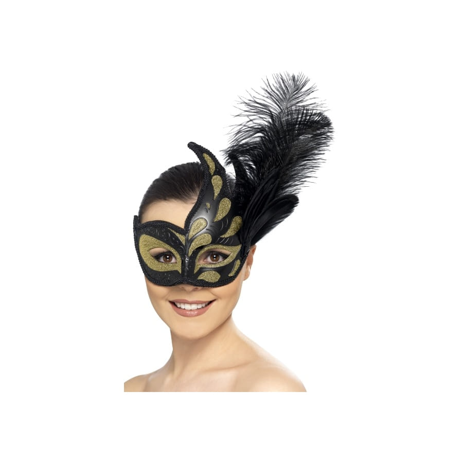 Ce loup resplendissant pour femmes est de couleur noire, orné de jolis motifs dorés. De hautes plumes noires sont fixées sur son côté gauche pour lui donner une touche chic et raffinée. Il se prêtera à de nombreux évènements : fêtes à thème, bal masqué, carnaval de Venise, ..., et vous permettra d'adopter une sensualité incomparable.