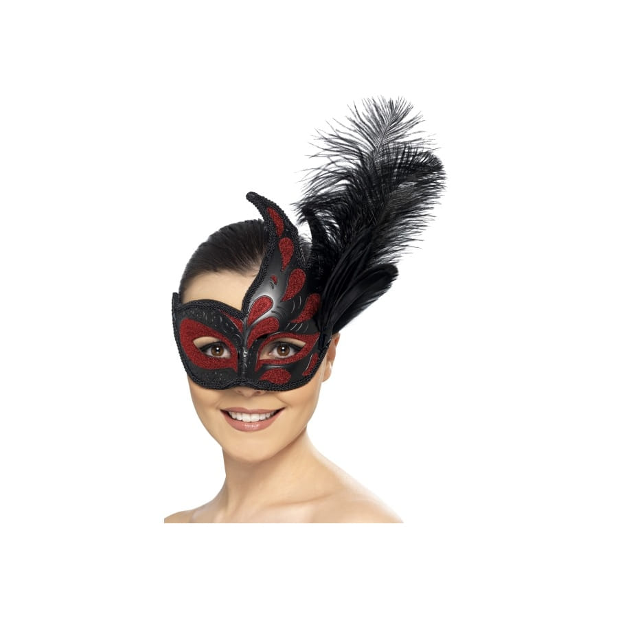 Les avis clients concernant loup colombine noir et rouge orné de plumes