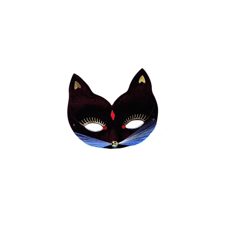 Loup pour femme représentant un chat de couleur noir avec décorations. Celles-ci incluent une paire de cils dorés et rouges, une paire de moustache bleue et un museau doré. Transformez-vous en chat sensuel pour une soirée.