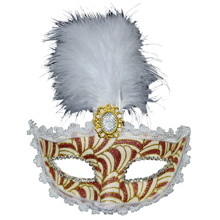 Le carnaval de Venise, c'est dans pas longtemps, et si vous voulez y assister, procurez-vous le masque idéal dès maintenant. Pour vous Mesdames, nous avons un magnifique masque décoré de plume, de dentelles et de paillettes. La plume de couleur blanche forme une belle touffe au-dessus du masque, les dentelles blanches, elles aussi, entourent le masque, et les paillettes rouge et dorée décorent à merveille le masque, qui mettra bien en valeur vos yeux. Au niveau du front, vous aurez également une belle pierre blanche scintillante avec un ornement doré.
