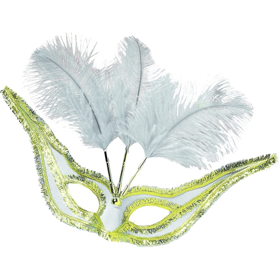 Loup de couleur blanche pour femme, avec bordure recouvert de dorure et agrémenté de 3 plumes blanches. Cet accessoire complètera à merveille un déguisement de grande dame vénitienne.
