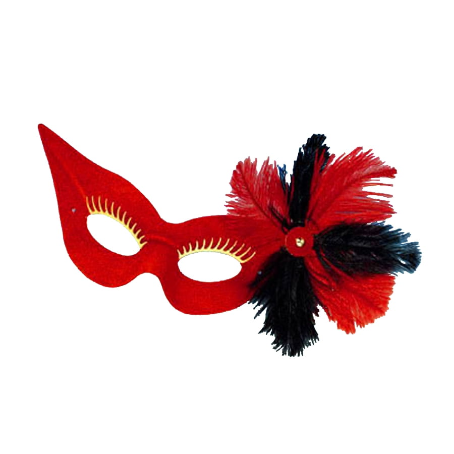 Entourez vous d'une aura mystérieuse et envoutante grâce à ce loup en tissu rouge et noir avec plumes, adulte.