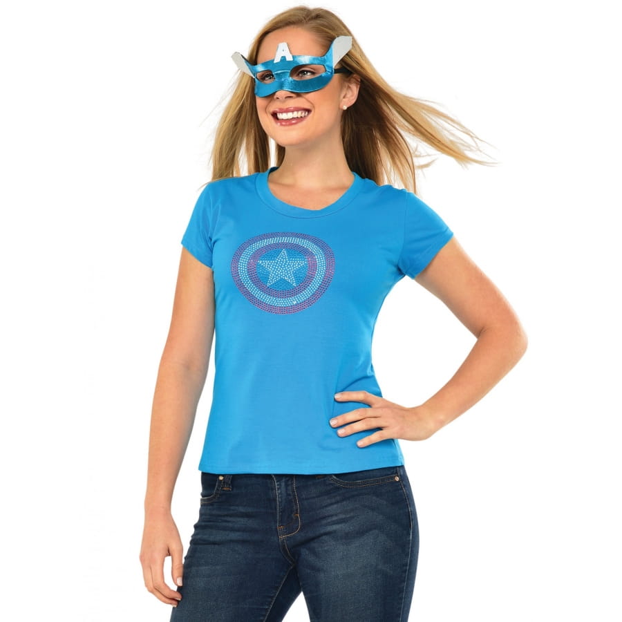 Loup et T-shirt à strass de Captain America, femme. Des accessoires parfaits pour incarner le super héros mythique de façon originale et en toute simplicité.