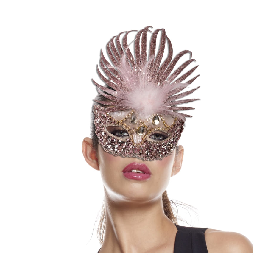 Ce loup haut rose paillettes et plumes reflète la féminité et l'élégance.
