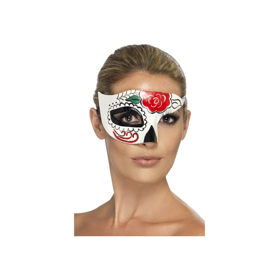 Pour que votre déguisement de squelette, de fantôme ou de sorcier soit parfait, utilisez ce loup pour le jour des morts. C'est un demi-masque de couleur blanche, noire, rouge et verte qui couvrira votre oeil droit très artistiquement. La taille est unique et il est idéal pour adulte, que vous soyez un homme ou une femme.