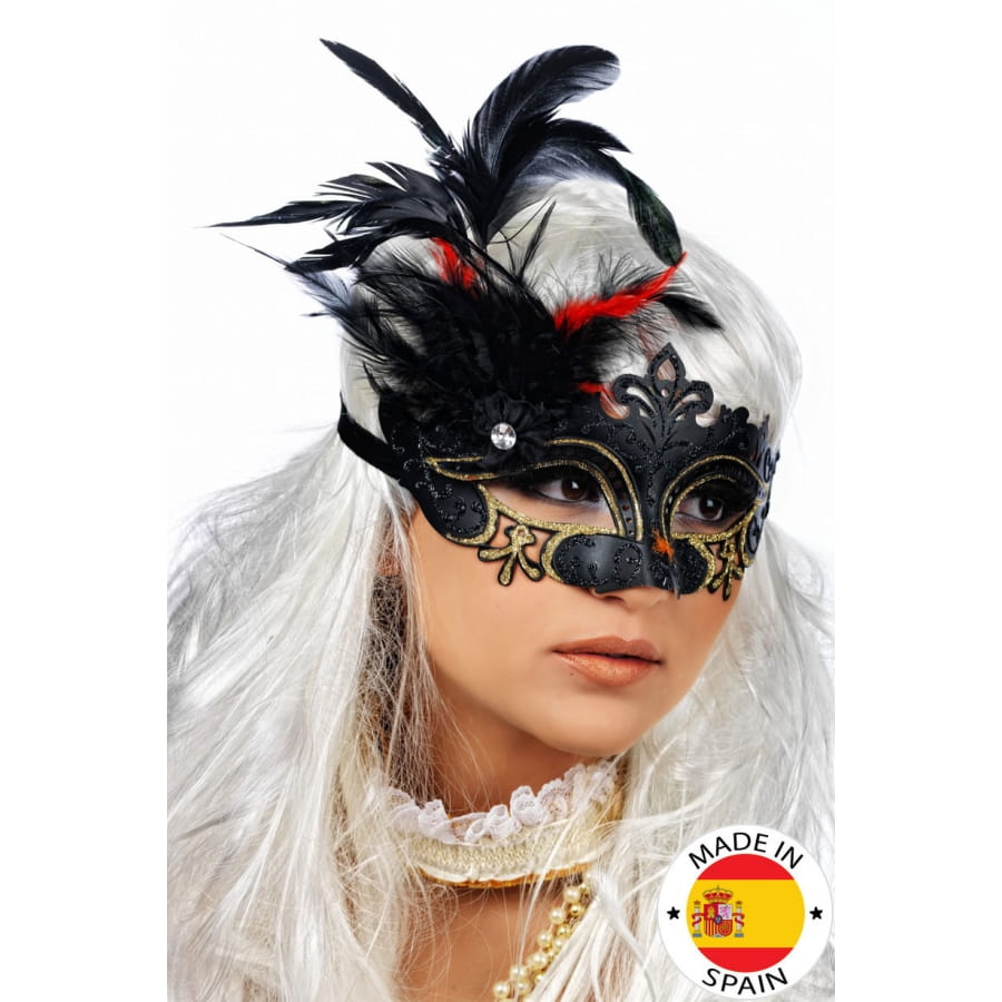 Ce loup noir et doré avec plumes est conseillé pour accompagner une tenue élégante.