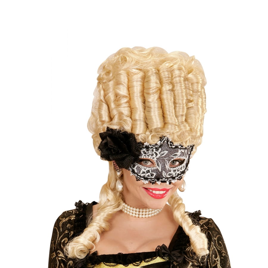 Assorti de strass transparents autour des yeux et d'une rose noire, le loup noire blanc avec dentelle et fleur noir réalisé sur le thème Venise, révèle votre côté séducteur et vous donne une allure de grande Dame.