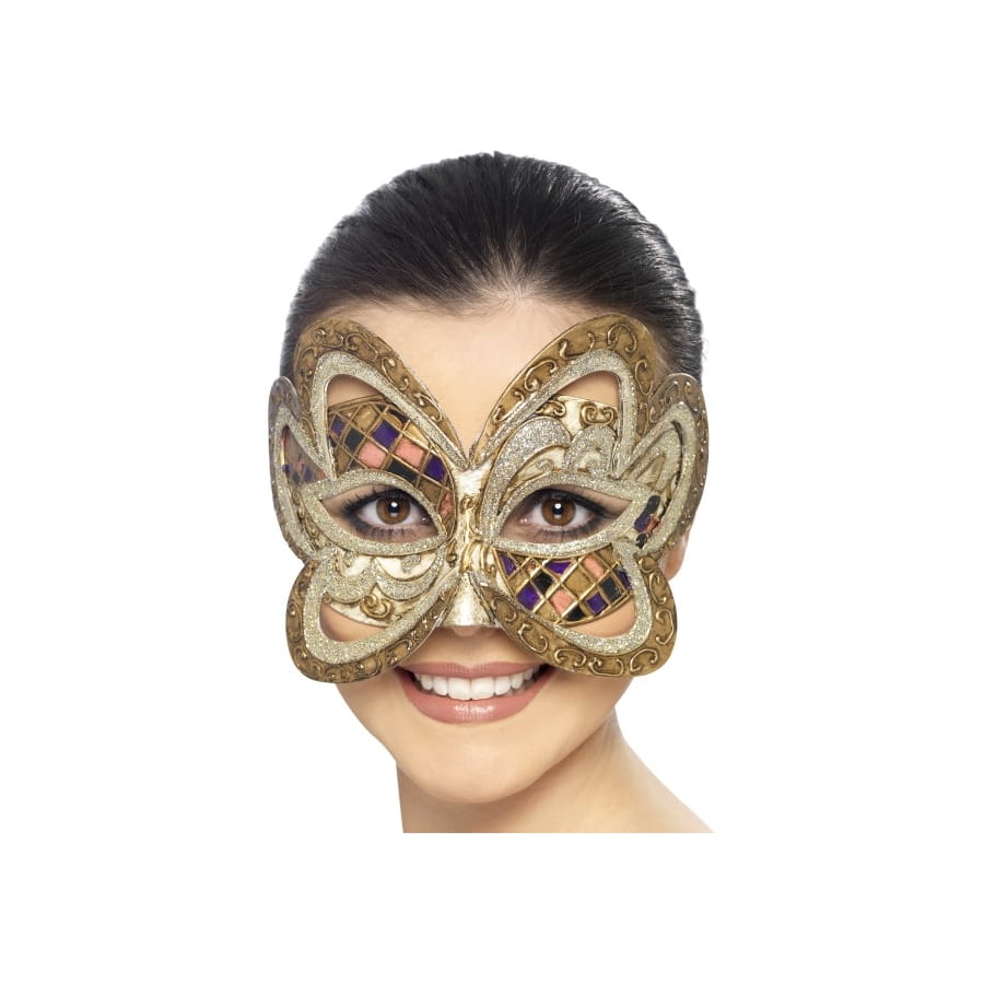 Mesdames, voici un ravissant loup, très sophistiqué, en forme de papillon doré, décoré de magnifiques paillettes et de quelques ornements en carreaux, tels des vitraux. Avec ce masque vénitien que nous vous proposons ici, vous serez une séduisante arlequin en version féminine, ou une mystérieuse femme masquée, à l'occasion d'une soirée sur le thème du cirque ou du voyage, et idéalement pour le carnaval de Venise.