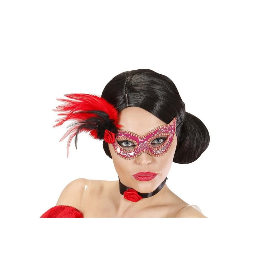 Mesdames, pour que votre tenue de fête soit parfaite, il faut un accessoire luxueux : ce loup rose doré avec plumes rouges et noires.