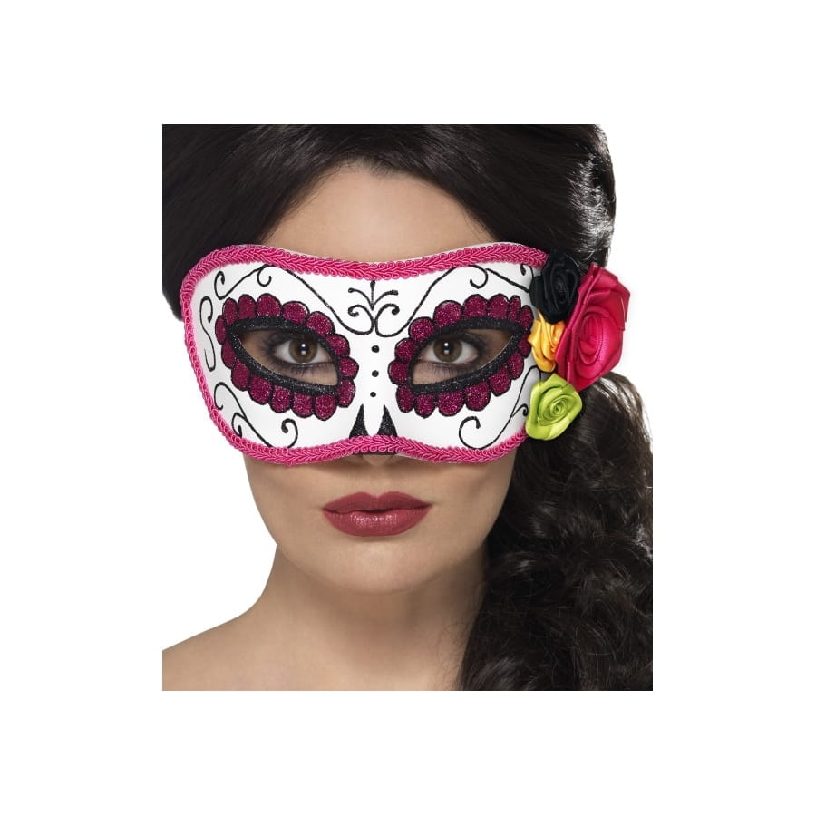 Les masques se portent en toute occasion : Halloween, bal masqué, carnaval. Laissez-vous emporter au Mexique à travers le loup rose jour des morts. De magnifiques motifs à la mexicaine ont été intégrés à ce masque de couleur blanche et rose. Il est également orné de quelques roses multicolores en tissu disposées sur le côté. Vous pouvez combiner l'accessoire avec un déguisement de squelette.