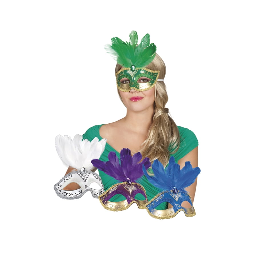 Voici un loup vénitien de toute originalité pour orner votre visage, Mesdames, à l'occasion d'une fête romantique ou vénitienne. Le loup en soi se posera, comme à l'accoutumée, pour cacher la partie de vos yeux, et de jolies plumes sont disposées au niveau du front pour embellir votre coiffure. Il est proposé en 4 couleurs différentes : le blanc, le bleu, le vert et le violet, mais vous n'aurez pas le choix de la couleur à la commande. En commandant plusieurs fois l'article, vous recevrez différents coloris.
