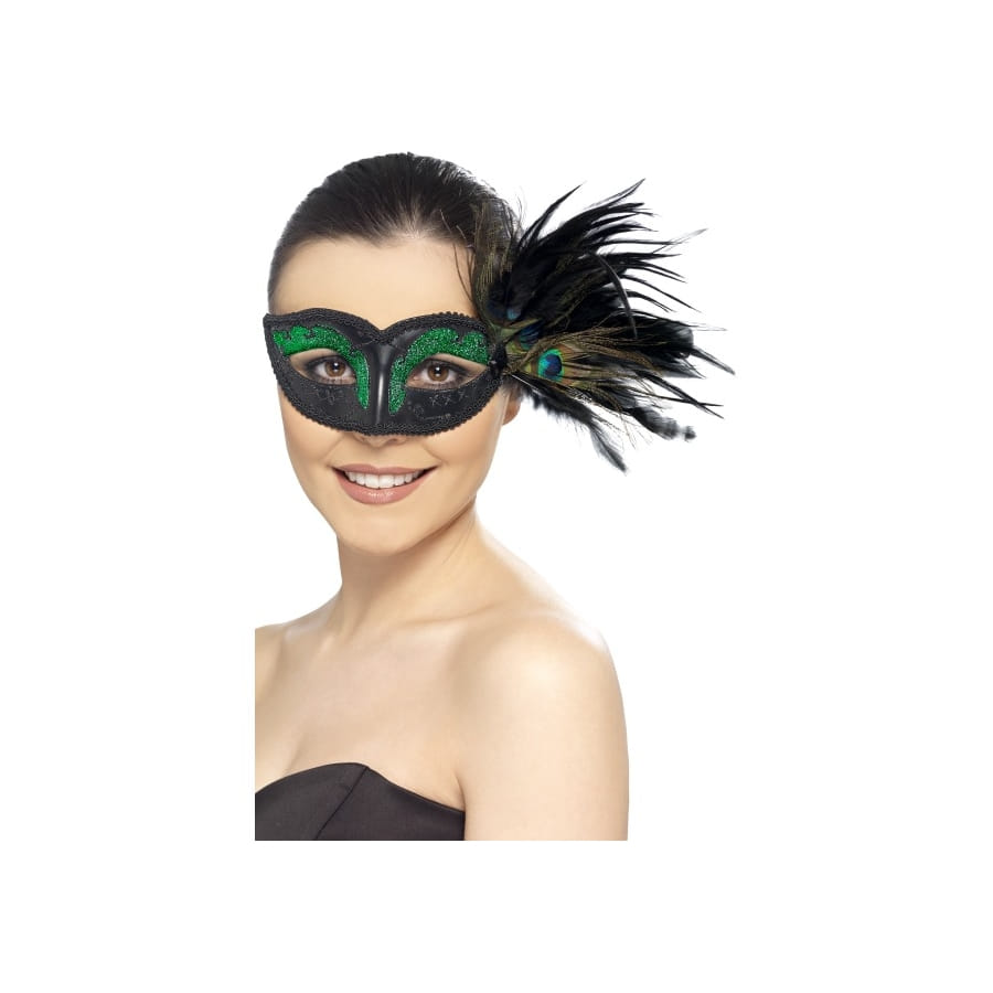 Ce loup vénitien angélique est orné de (fausse) plumes de paon, l'oiseau qui a les plus belles plumes du monde. Il est également agrémenté de paillettes vertes ainsi que d'un galon noir qui souligne son contour. Rien de tel que ce masque pour habiller votre visage de la plus belle des manières, le temps d'un bal masqué ou d'une fête sur le thème Venise.