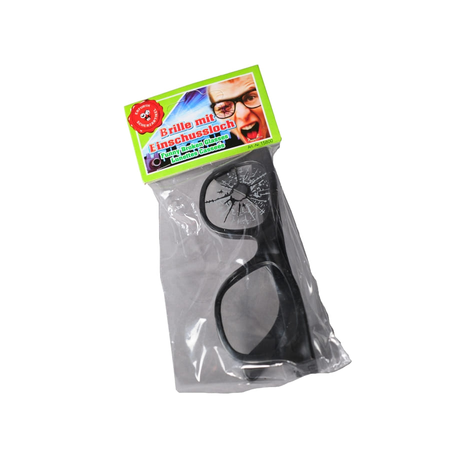Voici une paire de lunettes avec une monture noire et des verres transparents, dont l'un est brisé et imprimé de manière à représenter une balle de révolver qui l'a traversé. C'est un accessoire parfait pour surprendre les amis lors d'une soirée Halloween, ou lors d'un spectacle. D'ailleurs, il s'associera à merveille à votre déguisement de zombie intello, par exemple, ou de zombie professeur victime d'un tire dans l'oeil (quoi que les zombies ne survivent normalement pas à ce genre de blessure, sauf un super zombie!).