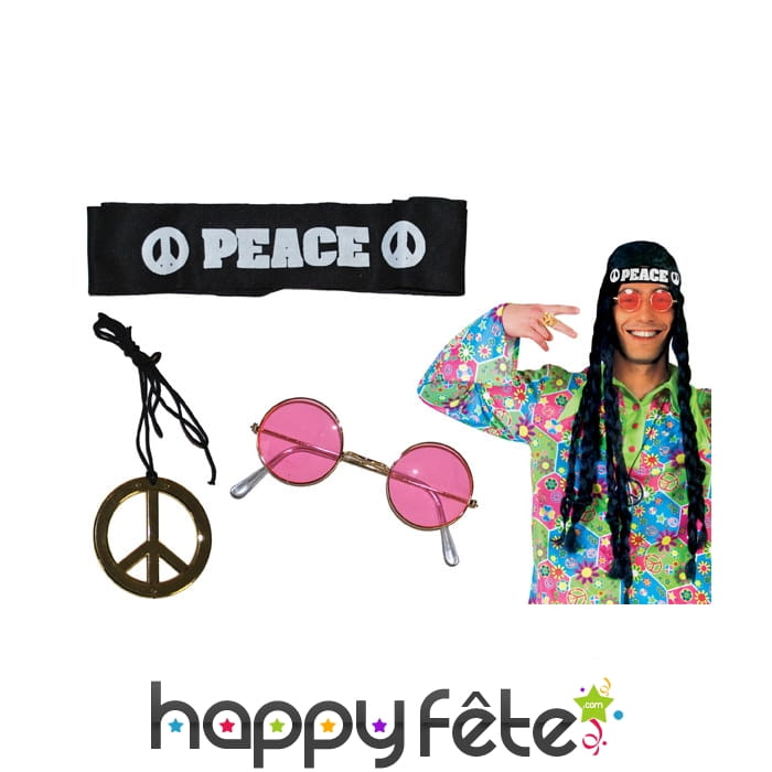 Le set comprend un bandeau noir imprimé du motif peace and love ainsi que d'une inscription peace, un collier argenté avec le même motif, et finalement des lunettes roses rondes avec une monture dorée.
