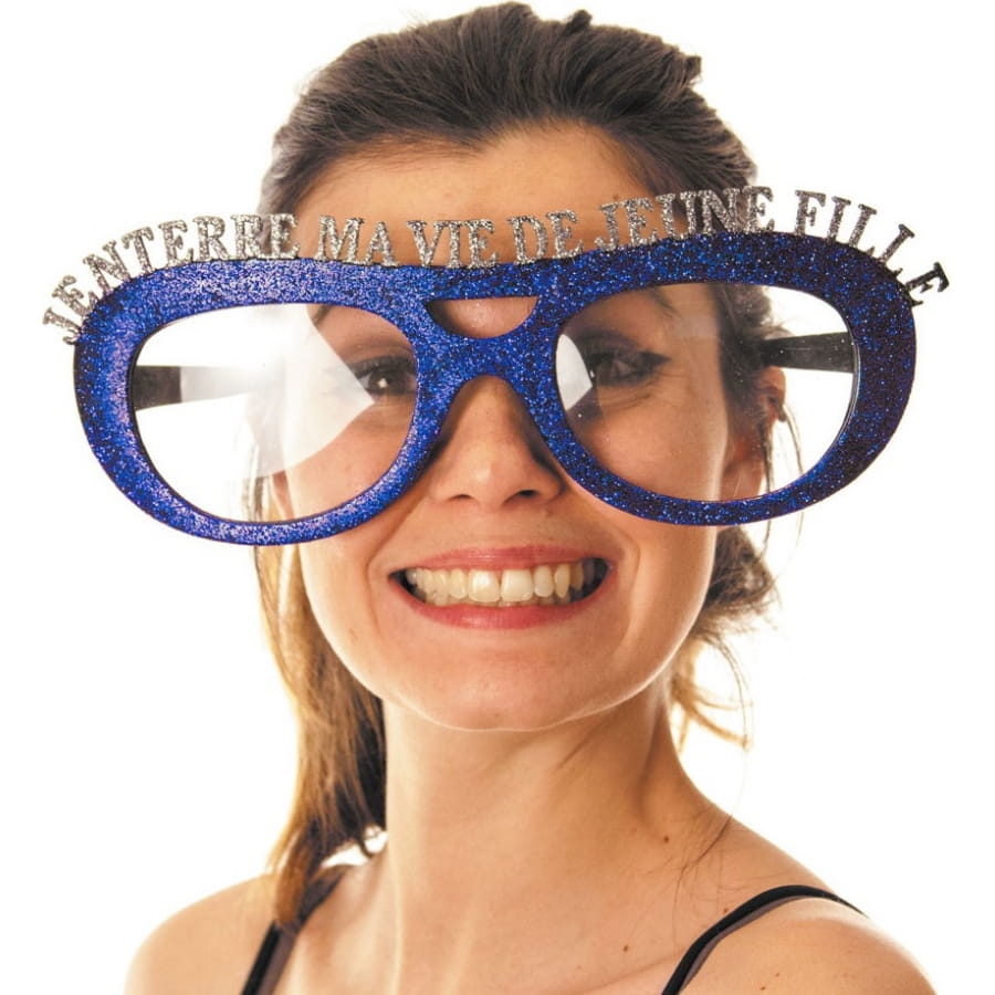 Des paillettes assurent la décoration de ces lunettes au-dessus desquelles on peut lire "j'enterre ma vie de jeune fille".