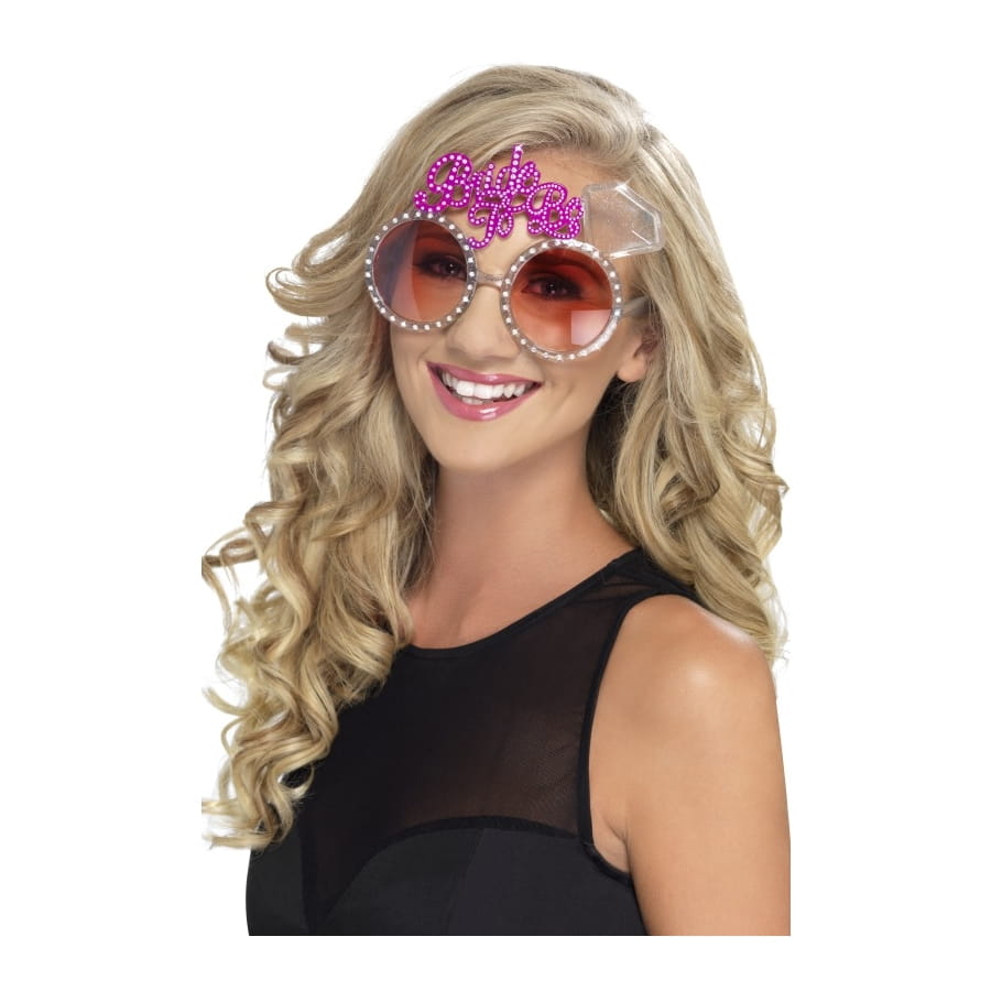 Paire de lunettes teintées pour femme, avec monture en strass blanc et montée de l'insigne "Bride to be" en strass rose. Ces lunettes excentriques sont exactement ce qu'il faudra pour un enterrement de vie de jeune fille réussi!