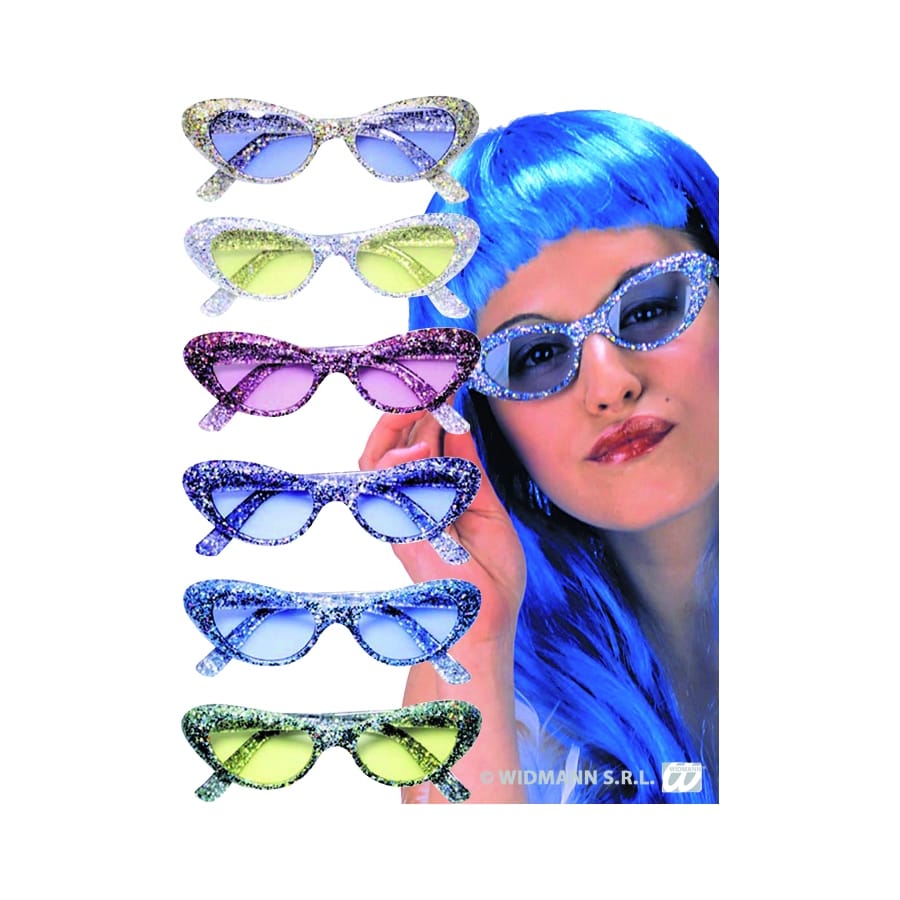 Lunettes Cats' Eyes UV400 parsemées de paillettes. Lorsque vous passerez la commande, il vous sera impossible de choisir le modèle ou la couleur. Vous recevrez les lunettes dans une des couleurs présentées: argent, blanc, rose, bleu, doré ou bleu pâle. Ces lunettes sont idéales pour toute soirée disco et paillettes.