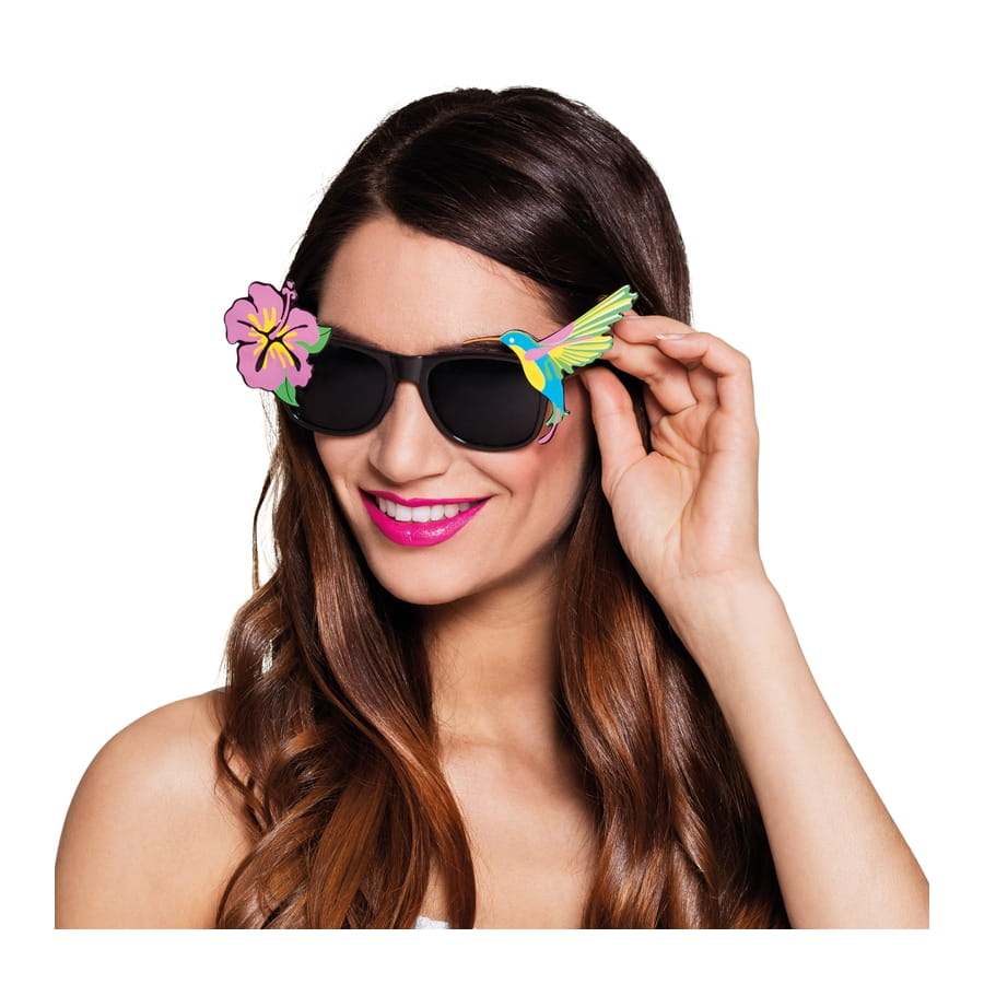 Une fleur d'un côté, un oiseau jaune et vert de l'autre, ce sont les décorations qui ornent ces lunettes colibri et fleur d'hibiscus.