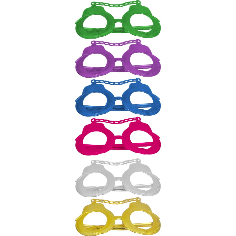 Lunettes en forme de menottes de couleur assortie. Cet accessoire pour fille ou garçon est vendu sans les verres. Au moment de la commande, vous ne pourrez choisir ni le modèle ni la couleur des lunettes. Vous les recevrez en blanc, bleu, jaune, rose, vert ou violet. Elles sont idéales pour un anniversaire bling bling.