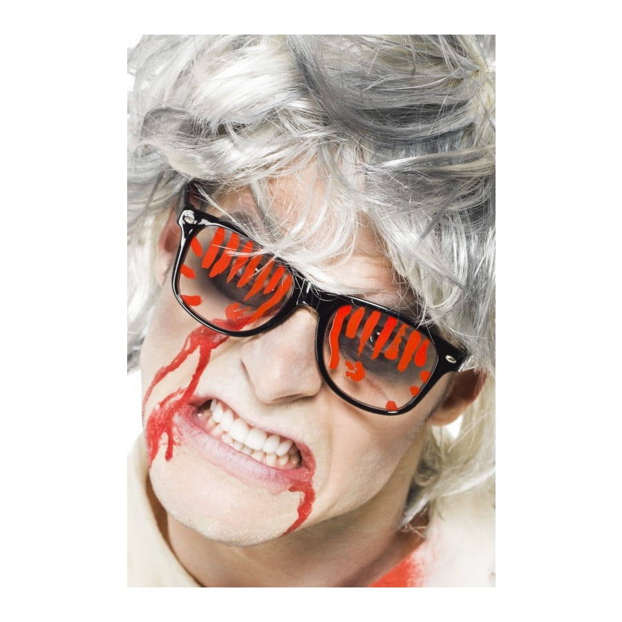 Paire de lunettes de geek de couleur noire, éclaboussées de sang rouge, pour homme ou adolescent. Portez ces lunettes et faites-vous passer pour une victime ou pour un zombie à l'occasion d'Halloween.