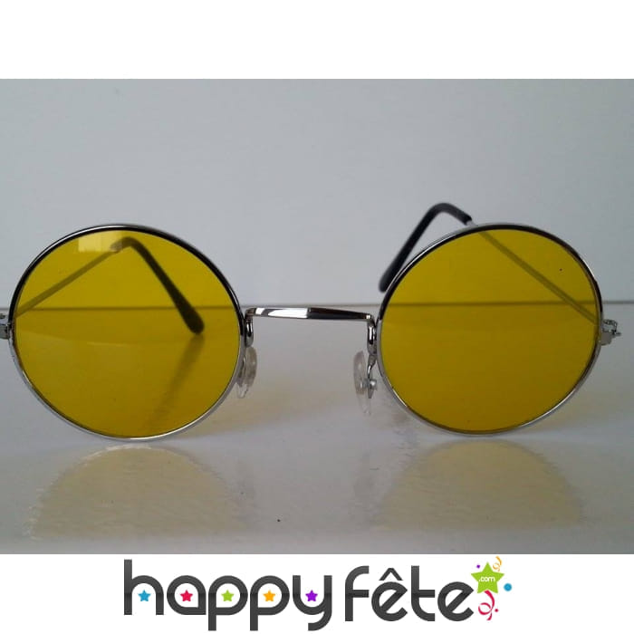 Paire de lunette hippie de couleur jaune et orange. Idéal pour un carnaval hippie ou pour une soirée disco et paillettes. Modèle rond avec fine monture.