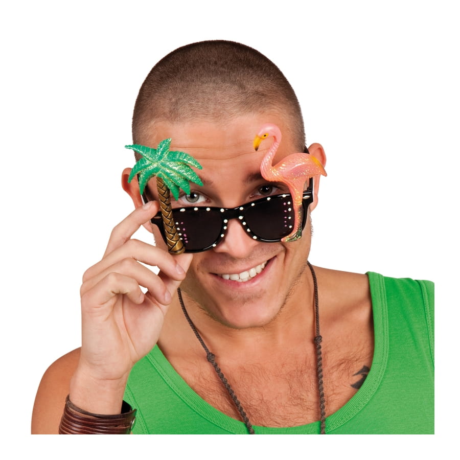 Enfilez vite cette paire de lunettes palmier et flamant rose, qui comme son nom l'indique, est ornée d'un palmier à feuilles verts d'un côté, et d'un flamant rose de l'autre.