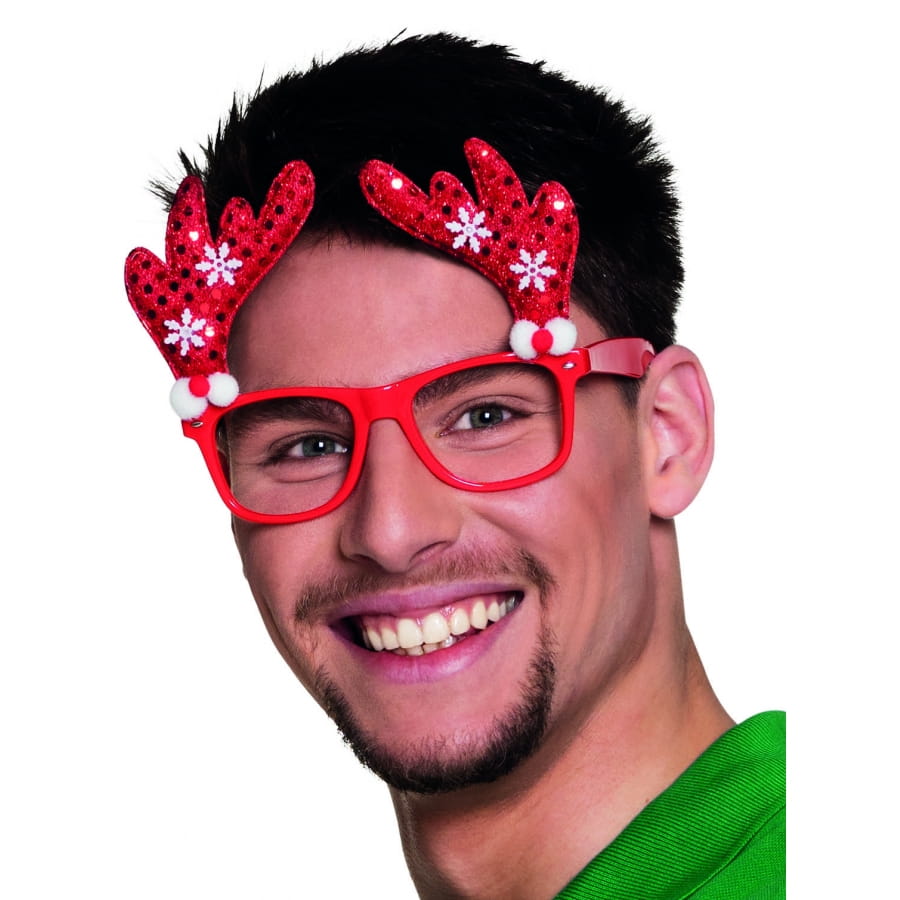 Cette paire de lunettes est décorée des cornes de renne en tissu rouge pailleté avec des flocons blancs.
