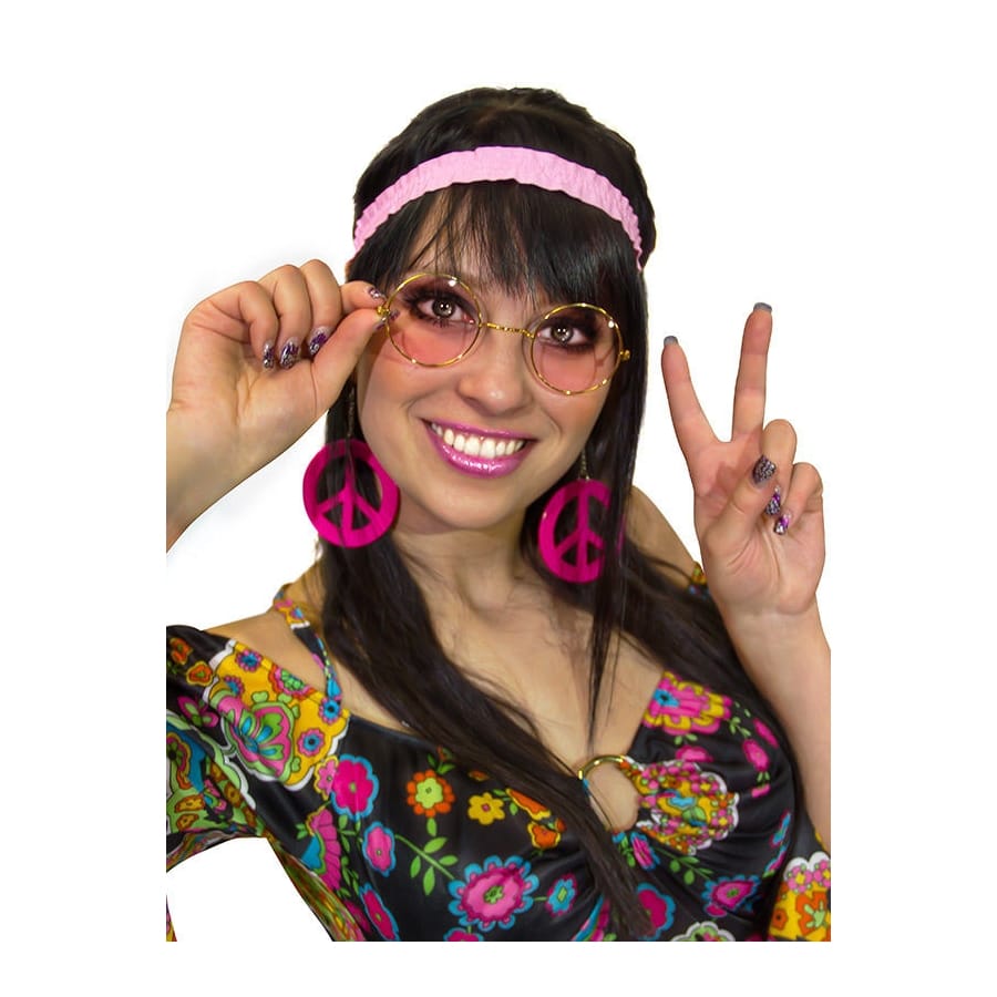 Pour un total look de hippie, complétez votre tenue avec ce kit de lunettes, serre-tête, boucles d'oreilles roses de hippie.