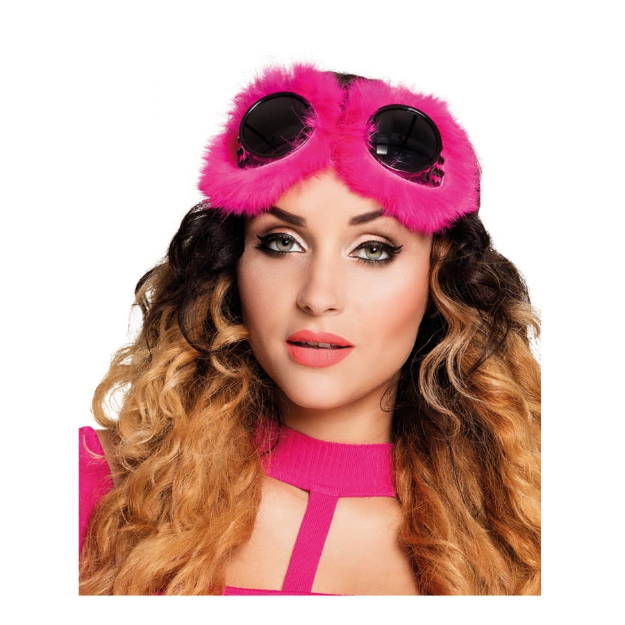 La monture et les verres noirs sont en plastique. Ils sont entourés de fausses fourrures de couleur rose fuchsia.