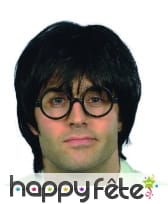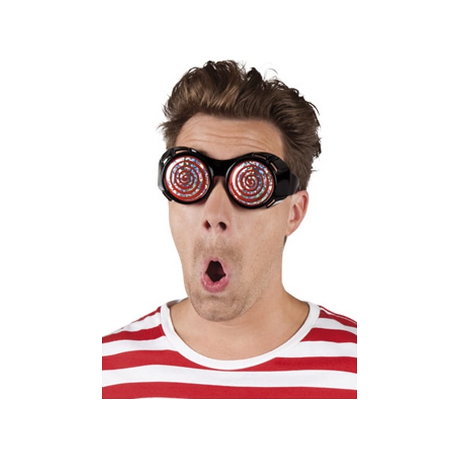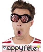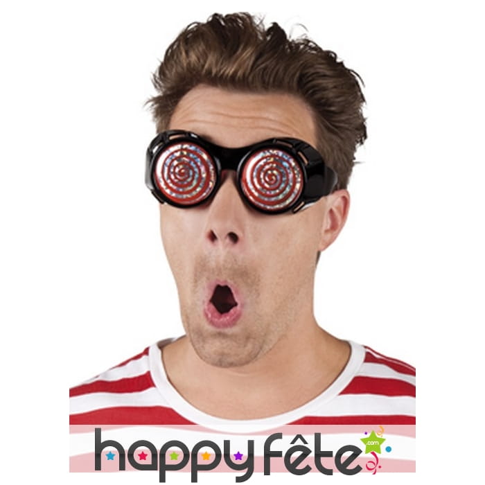Des verres de spirales rouge et blanche sont montés sur la grosse monture de couleur noire.