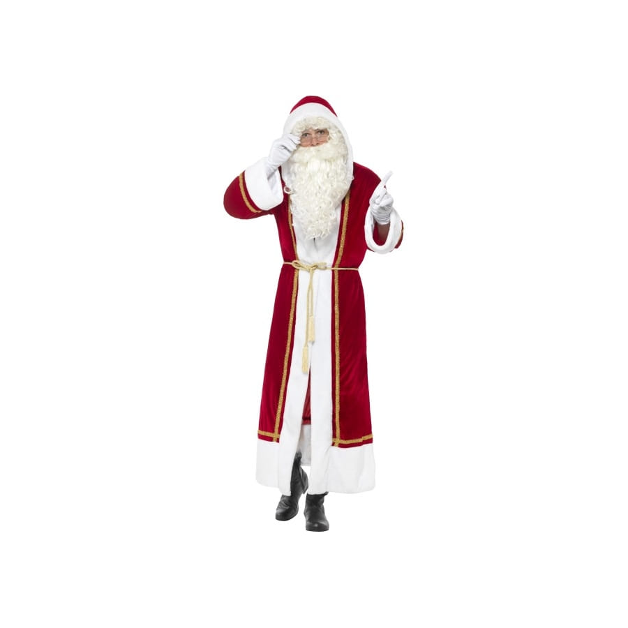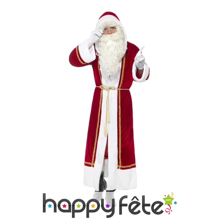 Le traditionnel costume du père noël ne saurait être plus élégant sans une cape. Cette luxueuse cape de père noël va faire sensation. Il s'agit d'une longue cape rouge avec liseré doré. Une fine ceinture de couleur beige à attacher autour de la taille vous sera aussi fournie. Le résultat ? Un papa noël coquet qui sait bien s'habiller !
