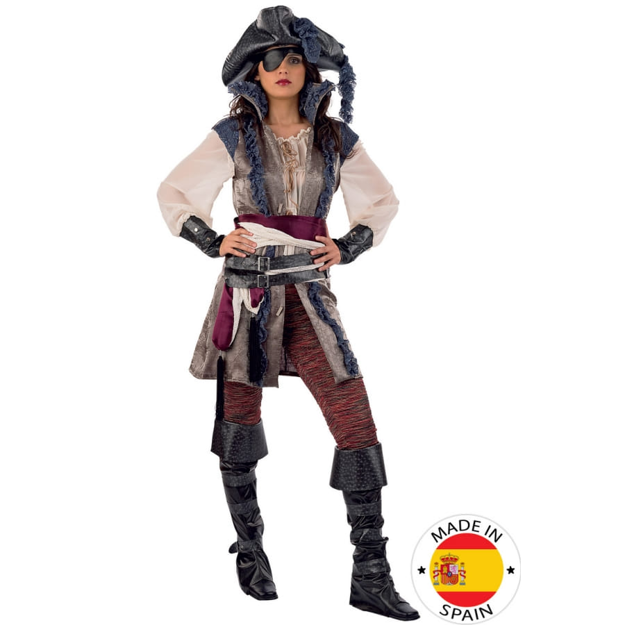 Mesdames, si vous recherchez une tenue qui en jette pour la fête des morts, nous avons ce qu'il vous faut. En effet, nous vous proposons le luxueux costume de piratesse. Le ton dominant de ce déguisement est le gris, retrouvé surtout au niveau de son long gilet à manches courtes. Les deux ceintures s'assortissent également à ce dernier. Sous le gilet se porte une chemise blanche à manches longues, avec du faux cuir au bout. La même matière a été reprise pour concevoir la paire de sur-bottes qui accompagne ce luxueux costume de piratesse. Quant au pantacourt, il est à rayures brillantes. A l'ensemble s'ajoute un chapeau de pirate et un cache oeil de couleur noire.