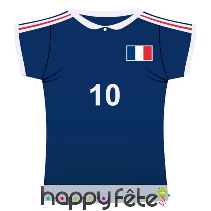 Voici un objet déco qui ravira le coeur des petits et grands férus des Bleus, l'équipe nationale de foot française. Il s'agit d'un maillot de foot, ayant un aspect très authentique, dans les couleurs tricolores, bleu, blanc et rouge bien sûr, avec un petit drapeau de la France. Mais il n'est pas à porter, il sert tout simplement à décorer. Il est fabriqué en carton dans une dimension de 31 x 33 cm.