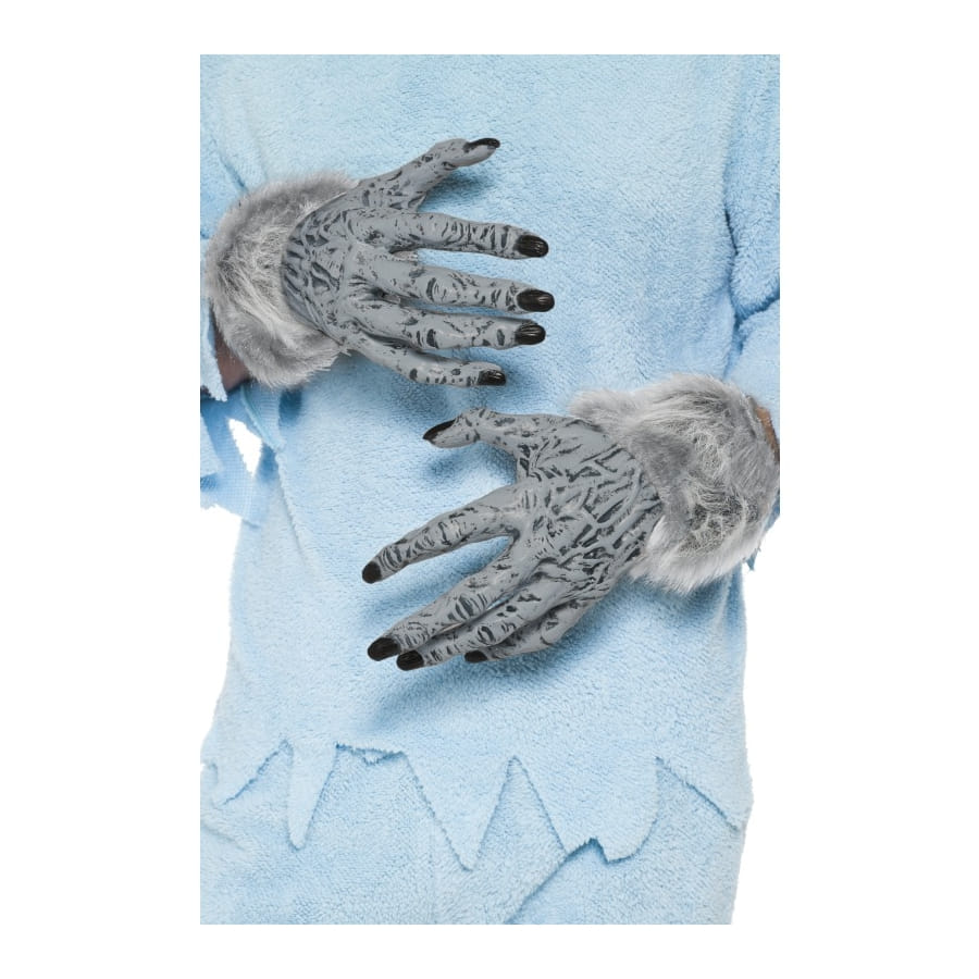 Paire de mains de loup-garou pour homme ou femme. Ces mains sont de couleur grises avec des poignets poilus et des ongles noirs. Attrapez vos camarades quand il fera sombre pour leur faire une peur bleue.