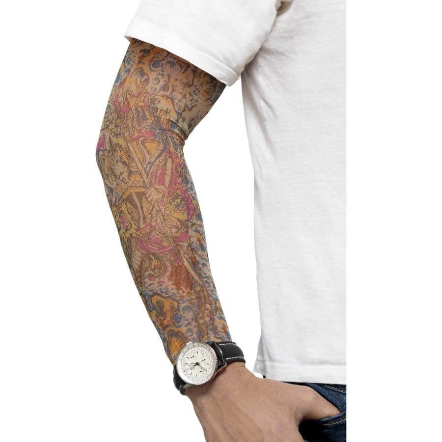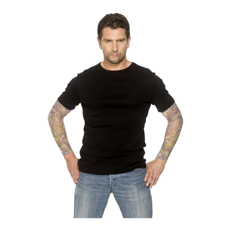 Paire de manches tatouées aux designs multiples et colorés, pour homme. Enfilez ces manches si vous souhaitez vous déguiser en biker pur et dur ou en punk rebelle.
