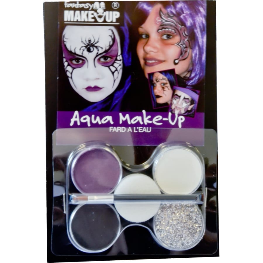 Un set de fard à l'eau pour votre maquillage de fée ou de sorcière. Vous pourrez vous en servir aussi pour tout autre maquillage. Ce set est composé d'un fard blanc, argenté, noire, violet et d'un pinceau.