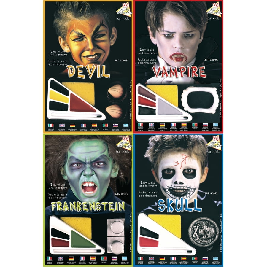 Kit de maquillage d'Halloween pour garçon. Au moment de votre commande, vous n'aurez pas la possibilité de choisir le déguisement que vous souhaitez et recevrez celui de démon, de vampire, de Frankenstein ou de squelette. Chaque set contient une éponge, la peinture pour visage, un pinceau ainsi qu'un accessoire relié au déguisement.