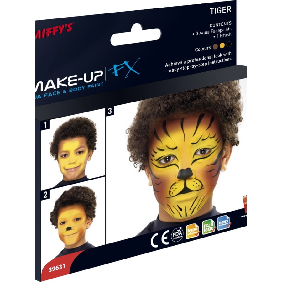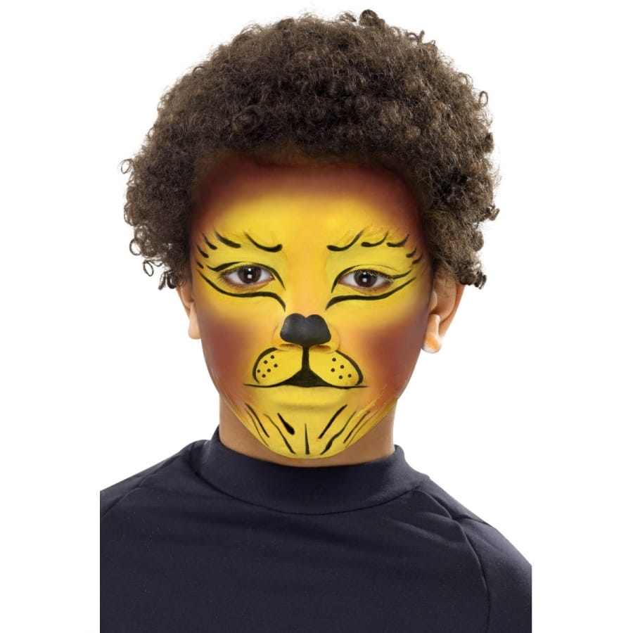 Maquillage pour visage d'animal sauvage pour homme, femme ou enfants. Ce kit est composé d'une palette de 3 couleurs, d'une petite brosse et d'un guide pas-à-pas. Les couleurs incluses sont le jaune, le noir et le marron, les 3 couleurs basiques pour un maquillage d'animal.