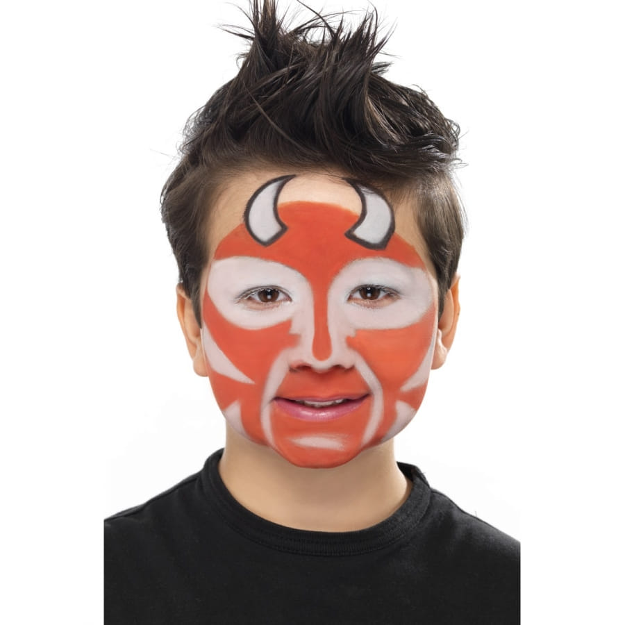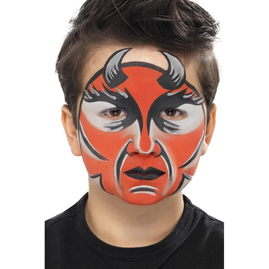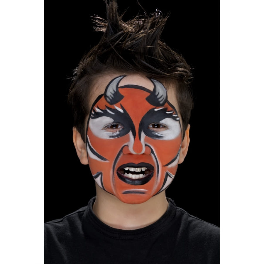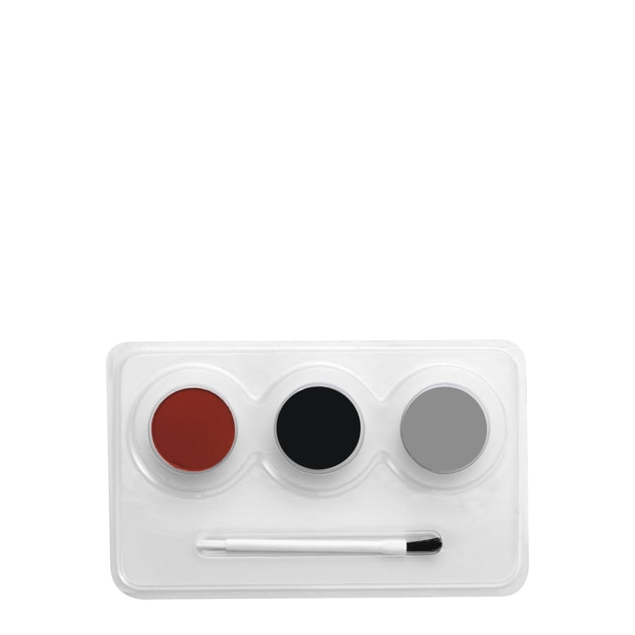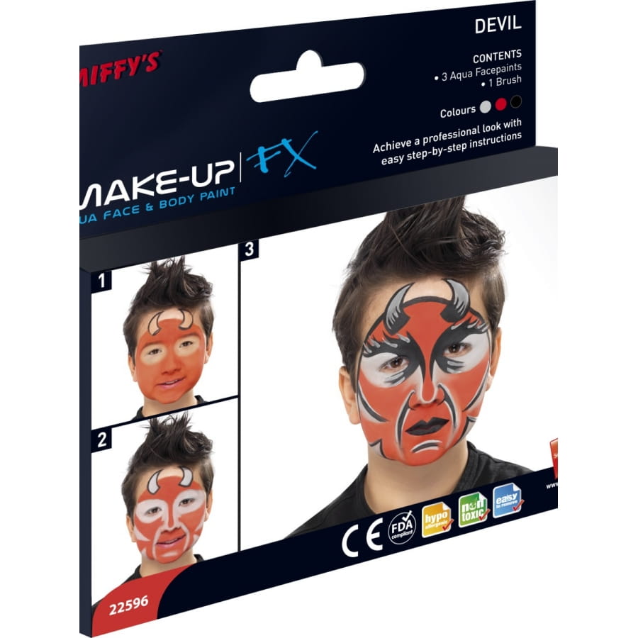 Set de maquillage de diable composé d'une brosse et des couleurs grise, rouge et noire. Appliquez le maquillage à l'aide de la brosse pour composer un maquillage de diable unique et original.
