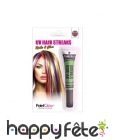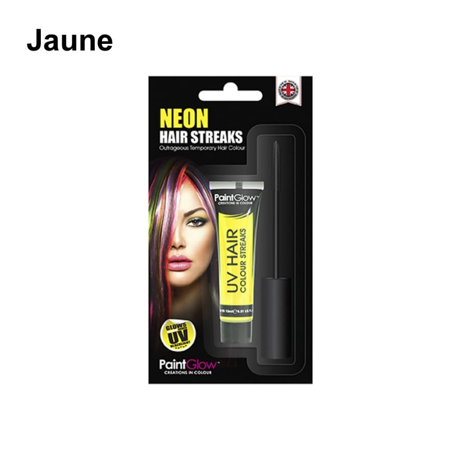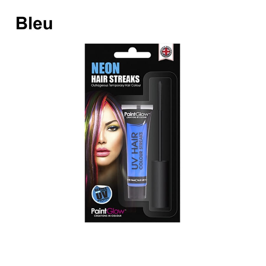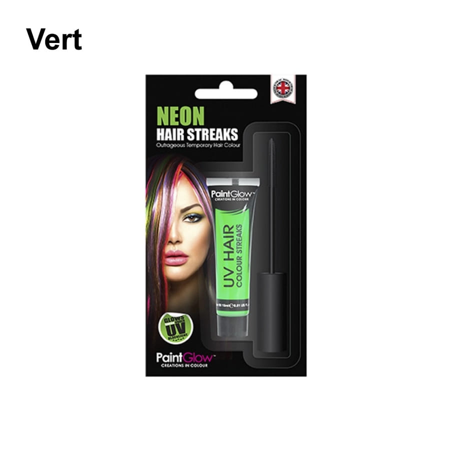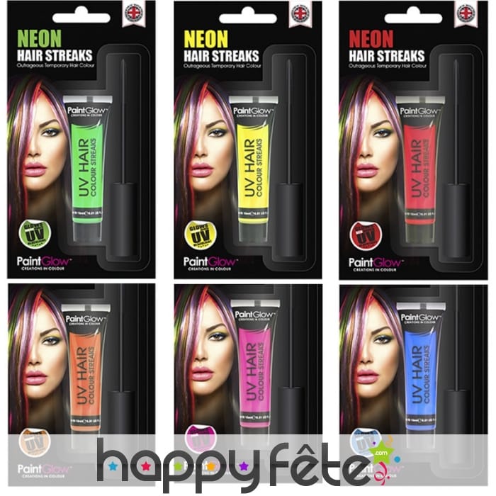 Pour colorer vos cheveux de manière temporaire lors d'une soirée Halloween ou autre, l'article Mascara fluo pour cheveux UV vous permettra de maquiller vos cheveux avec les couleurs suivantes : jaune, vert, bleu, rose, orange et rouge. Ce mascara destiné aux adultes est offert en tube de 15 ml sous blister. Il réagit aux UV et n'émet pas sa propre lumière.