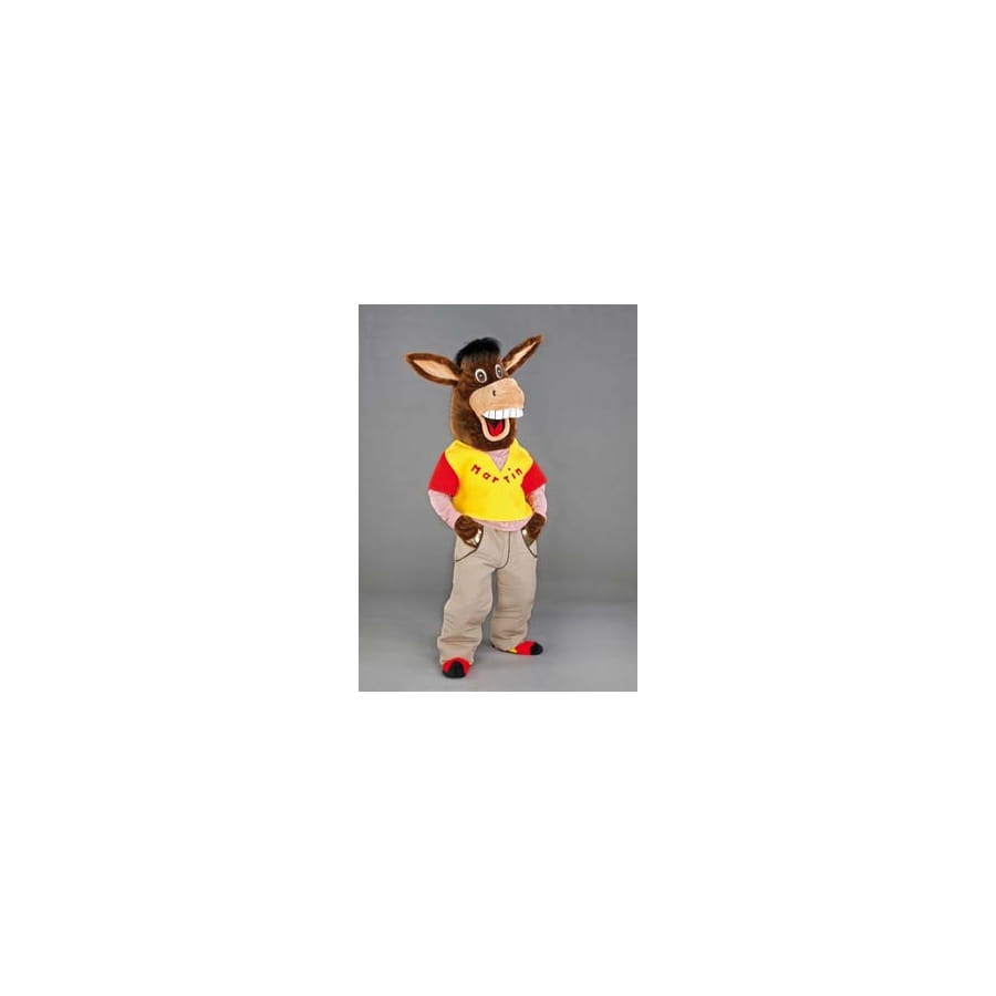 Ce déguisement de mascotte est composé du corps vêtu d'un t-shirt jaune et rouge et d'un pantalon beige, de la tête d'âne, des gants en forme de pattes ainsi que des surchaussures à mettre au dessus de vos chaussures. De taille unique, ce déguisement convient tout de même à la plupart des adultes mesurant de 1m60 à 1m90.