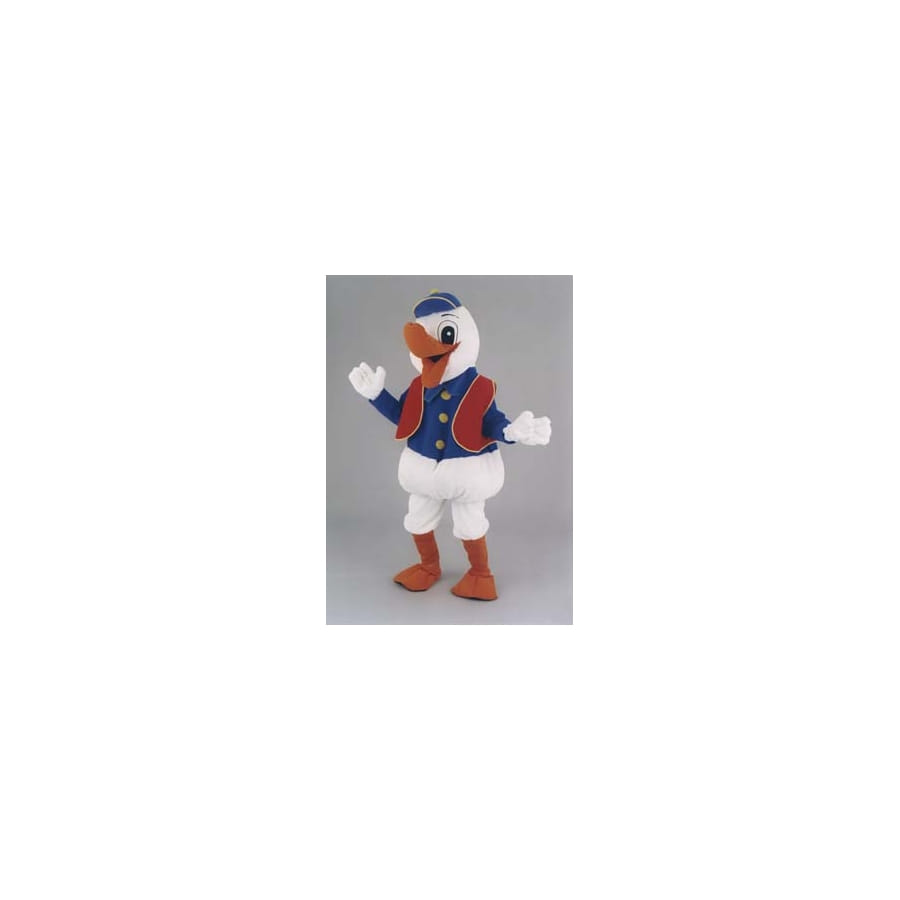 Costume de canard blanc habillé en costume rouge et bleu. Le costume est disponible en taille unique (1m60 à 1m90). Belle qualité, confortable, construit sans éléments durs et respecte les normes CE de sécurité. Il est composé du corps, tête, gants et sur-chaussures. Idéal pour évènements sportifs ou animations. Personnalisation sur demande de devis (marquage logo, modification couleur, etc.).
