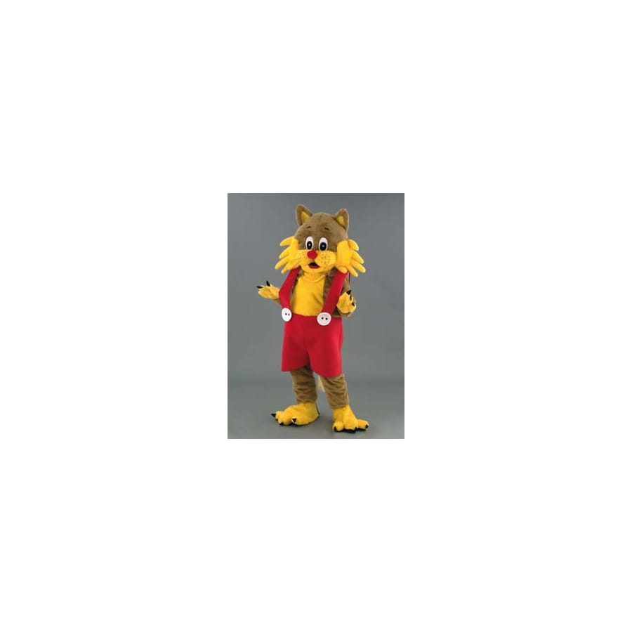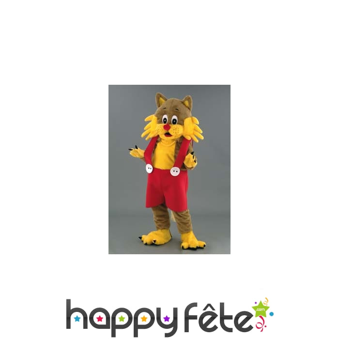 Ce déguisement de mascotte chat est composé des gants, des sur-chaussures en formes de pattes (chaussures à mettre au dessus de chaussures traditionnelles), du corps avec salopette rouge et de la grosse tête. Ce déguisement est de taille unique mais elle convient aux personnes mesurant de 1m60 à 1m90.