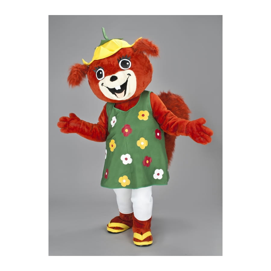 Déguisement de mascotte écureuil en robe. Le chapeau jaune est cousue à la grosse tête. Le corps est également cousus avec la robe verte à fleurs et le pantalon blanc. Les gants sont des gants à 4 gros doigts. Les sur-chaussures tongs tongs s'enfilent au dessus de chaussures traditionnelles. Pour l'entretient et le lavage, nous vous conseillons de ne pas dépasser les 30 degrés. Entièrement fait en France, cet ensemble est uniquement composé d'éléments mous (normes CE). Si vous souhaitez modifier l'aspect du déguisement (que ce soit la couleur, l'impression d'un logo, etc.) sachez que cela reste possible. Il vous suffit de nous envoyer une demande par e-mail ou de nous téléphoner. Pour la fabrication et la livraison, comptez 3 semaines maximum. La taille correspond à une morphologie de 1.6 à 1.9 m