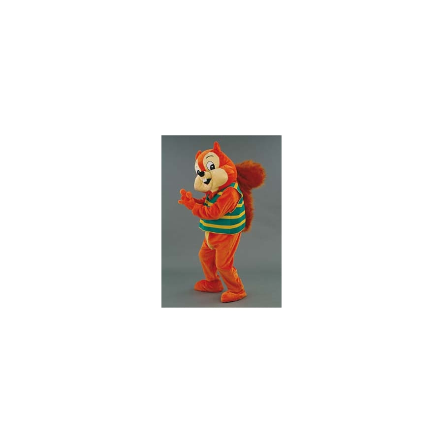 Costume mascotte d'écureuil orange habillé d'un t-shirt rayé vert et jaune. Le costume est disponible en taille unique et est difficilement inflammable. Il respecte les normes CE de sécurité. Pour un entretien optimal nous vous conseillons de le laver et le sécher à 30°C max. Ce costume est très confortable et construit sans éléments durs. Une personnalisation sur demande de devis est possible.