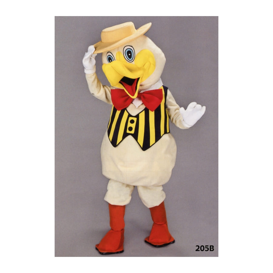Déguisement de mascotte oie zizi coincoin (cocktail belge). Le chapeau couleur paille est cousu à la grosse tête. Le corps est également cousus avec le noeud papillon rouge et le boléro jaune. Les gants sont des gants à 4 gros doigts. Les sur-chaussures en forme de pattes s'enfilent au dessus de chaussures traditionnelles. Pour l'entretient et le lavage, nous vous conseillons de ne pas dépasser les 30 degrés. Entièrement fait en France, cet ensemble est uniquement composé d'éléments mous (normes CE). Si vous souhaitez modifier l'aspect du déguisement (que ce soit la couleur, l'impression d'un logo, etc.) sachez que cela reste possible. Il vous suffit de nous envoyer une demande par e-mail ou de nous téléphoner. Pour la fabrication et la livraison, comptez 3 semaines maximum. La taille correspond à une morphologie de 1.6 à 1.9 m